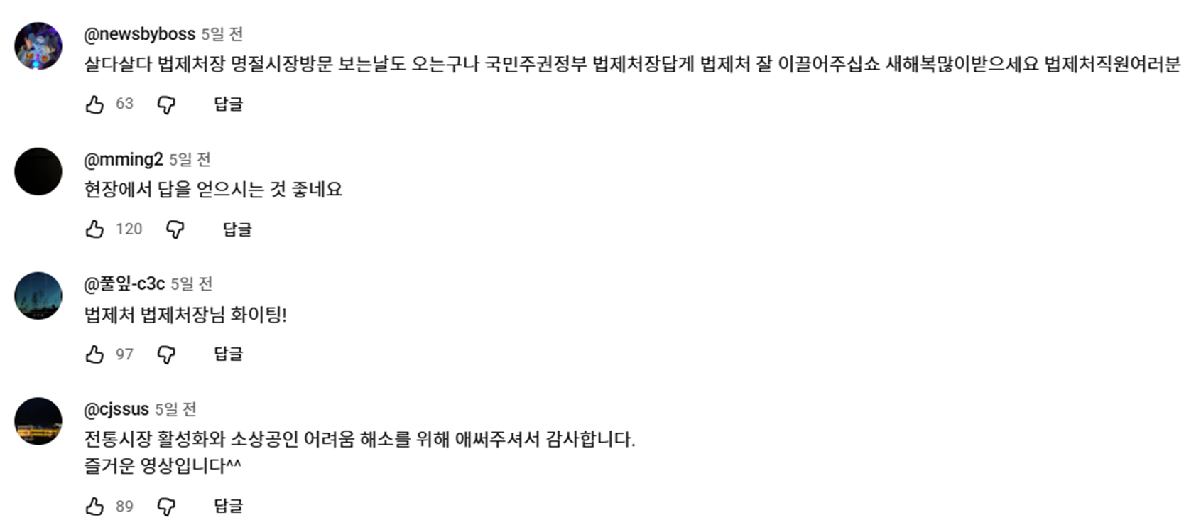 - 영상 목록 중에서 법제처의 영상이 좋아요 수 상위에 오른 매우 특이한 모습을 확인할 수 있었습니다. 해당 영상은 법제처장이 전통시장을 방문한 2분 남짓한 영상한 영상이지만 상당히 좋은 수치 성과를 확보해 다른 기관과 달랐습니다 특히 댓글 중에서는 아래와 같은 긍정적인(?) 댓글이 남겨져, 법제처의 활발한 소통이 성과로 이어지는 모습을 확인할 수 있었습니다.