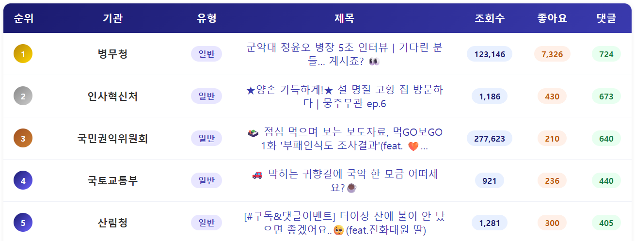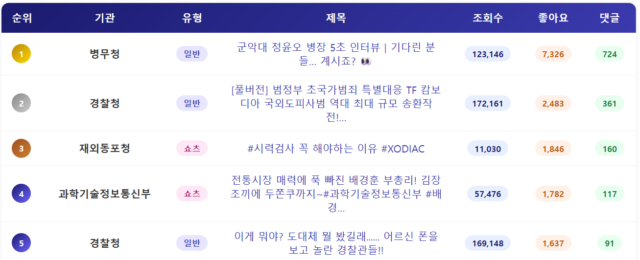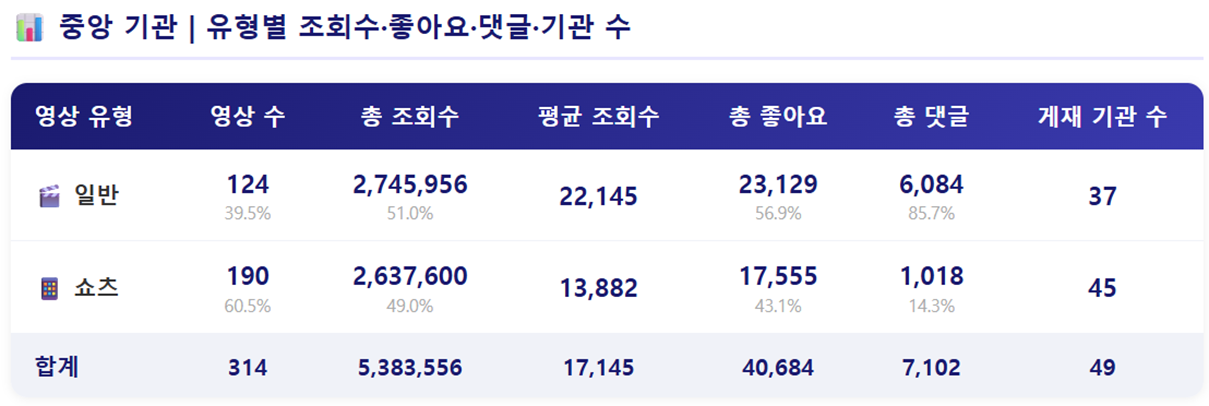 - 전체적으로 일반영상의 조회수 성과가 좋게 나타난 가운데, 행정안전부와 농림축산식품부의 댓글 수가 눈에 띕니다. 조회수는 포은데 댓글 수는 0개 혹은 1, 2개 정도로 매우 적기 때문입니다. 이 중 2건은 쇼츠, 2건은 일반영상인데, 쇼츠영상은 댓글 확보가 어려운니 그렇다고 해도, 높은 조회수를 확보한 일반영상의 댓글 수가 거의 없는 건, 영상에 대한 신뢰도를 낮출 수 있어 보완이 필요해 보입니다.