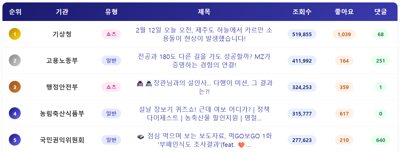 - 2026년 2월 2주 중앙행정기관 유튜브 채널에 게재된 영상의 조회수 분석 결과, 기상청 <2월 12일 오늘 오전, 제주도 하늘에서 카르만 소용돌이 현상이 발생했습니다!> 영상이 수집일 기준 51.9만회로 가장 높았습니다. 신기한 기상환경에 대한 높은 관심과 함께 언론에서도 카르만 소용돌이 현상에 다수 주목하면서 좋은 성과로 이어진 것으로 분석됩니다. 최근 기상청에서 신기한 기상현상을 소개하는 쇼츠영상을 다수 게재하고 있는데, 이 영상에 대한 반응이 좋게 나타나고 있습니다. 이러한 흐름을 이어받아 신기한 기상현상만을 보여주는 것이 아니라, 왜 이러한 현상이 나타나는지를 설명하는 콘텐츠로 이어지는 것도 좋은 방향이지 않을까 슬그머니 제안해 봅니다.