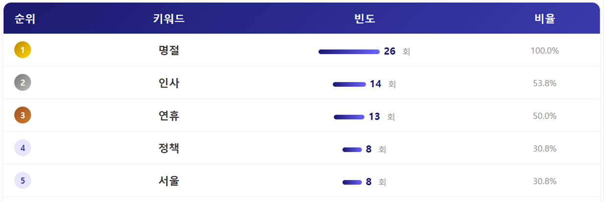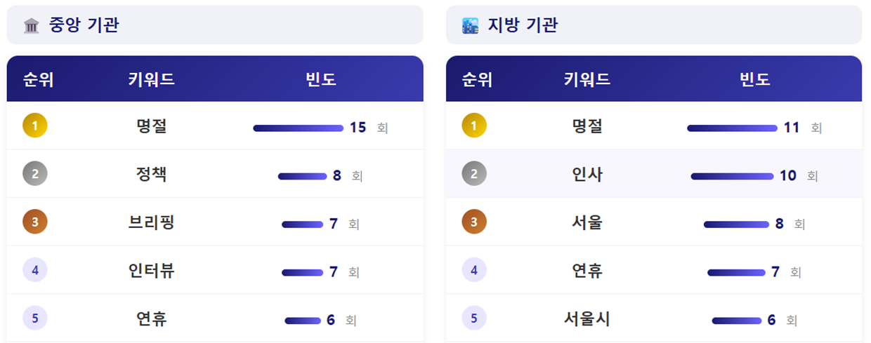 - 중앙행정기관과 광역자치단체의 키워드를 비교해보니 '명절' 키워드가 1위인 것은 동일하나 뒤를 이어 나타난 키워드에서 차이를 보이고 있었습니다. 중앙행정기관의 경우에는 정책과 브리핑 키워드가 뒤를 이으며 '정책'에 중점을 두는 모습인 반면, 광역자치단체는 '인사' 키워드가 2위로 나타나 시민들과 소통하는 영상이 다수를 차지했음을 확인할 수 있습니다.