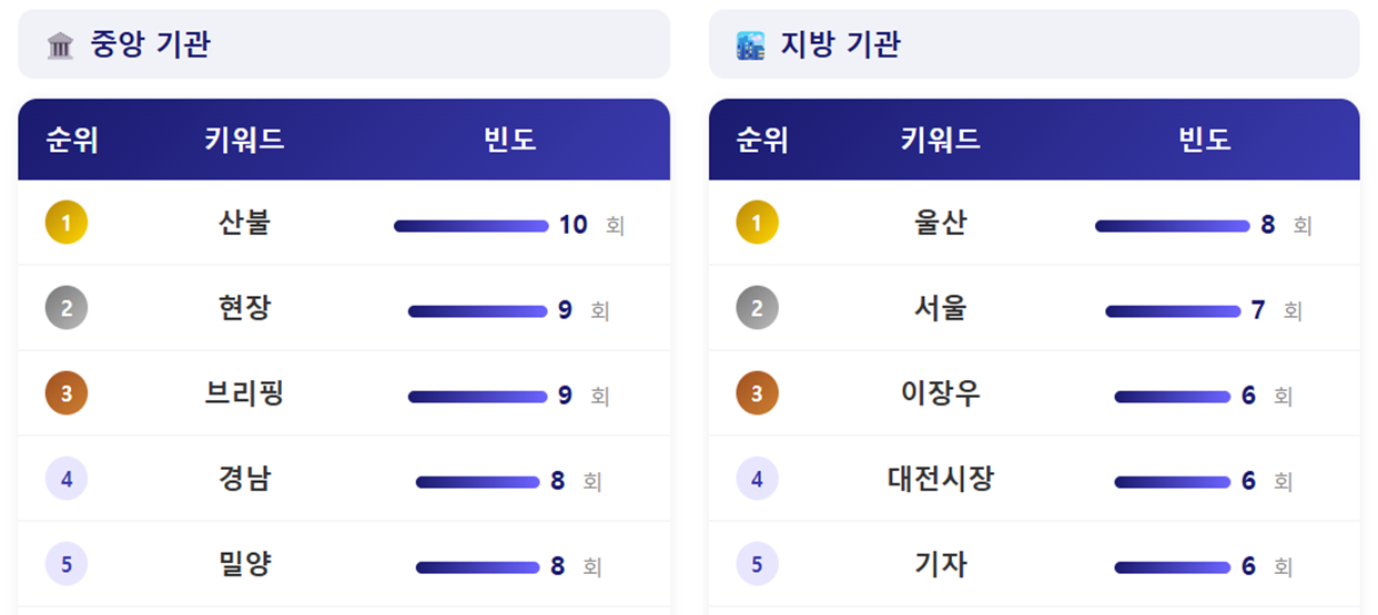- 광역자치단체의 경우에는 울산 키워드가 가장 많았습니다. 울산에서 21건의 영상을 게재한 만큼 울산 관련된 언급이 많았기 때문으로 보입니다. 더불어 대전시장과 이장우 키워드의 경우에는, 기관장의 브리핑 영상이 많았기 때문입니다.