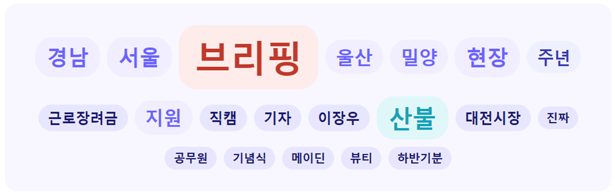 - 2026년 2월 4주 중앙행정기관과 광역자치단체 유튜브 채널에 게재된 영상의 제목에서 키워드를 추출하여 분석한 결과, 가장 많은 키워드는 '브리핑'으로 나타났습니다. 아무래도 공공기관이다 보니 업무 관련 브리핑, 기관장의 현장 동정 브리핑 등의 영상이 다수를 차지하고 있기 때문으로 보입니다.