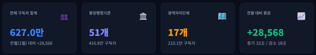 - 2026년 2월 말 기준으로 중앙행정기관과 광역자치단체 유튜브 채널의 구독자수는 총 627만 명으로 나타났으며, 1월말 기준 약 2만 8천 명의 구독자가 증가한 것으로 나타났습니다.