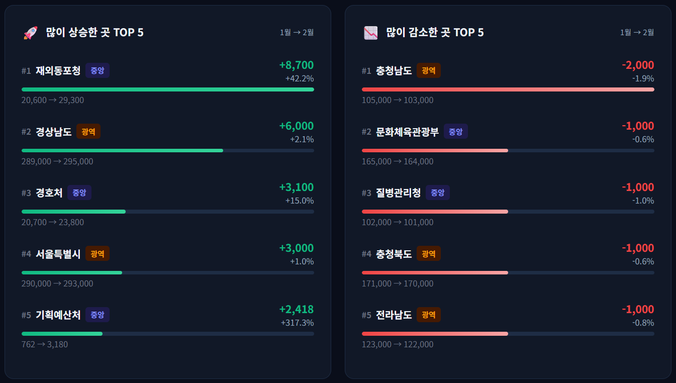 - 경호관 시리즈를 꾸준히 게재하고 있는 경호처가 계속해서 상승 추세를 보이고 있으며, 설립된지 얼마 되지 않은 기관인 기획예산처 역시 구독자가 크게 상승했습니다.