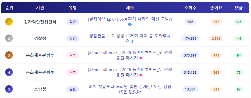 - 이와 함께 최근 발발한 중동 사태와 관련하여 이재명 대통령이 언급한 주유소 기름값과 관련된 대책을 전달하는 재정경제부의 쇼츠영상과 재외국민 보호와 관련된 활동을 전달하는 국무총리실의 쇼츠영상이 다수 조회수를 확보했습니다.
