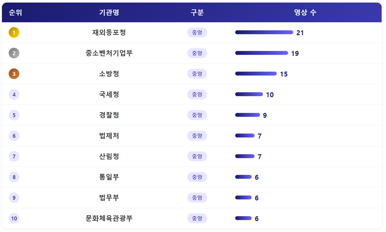 - 기관별로 게재한 영상 수를 살펴보면 재외동포청이 한 주간 21건의 영상을 게재해 가장 많았습니다. 아이돌이 등장하는 웹에능 영상과 함께 이를 재편집한 직캠을 다수 게재하고 있고, 초반과 달리 이들 영상이 조회수 등에서 좋은 성과를 얻고 있는 중입니다. (물론 아직까지도 아이돌 영상이 재외동포청 유튜브 채널에 게재되는 이유를 정확히 이해하지는 못하고 있습니다. ^^;) 뒤를 이어 중소벤처기업부가 19건의 영상을 게재했으며, 소방청이 15건을 게재했습니다.