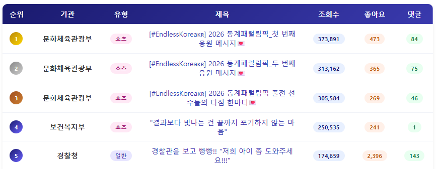 - 3월 1주 중앙행정기관 유튜브 채널에 게재된 영상의 조회수 분석 결과, 문화체육관광부에서 동계패럴림픽 응원을 목적으로 게재한 쇼츠영상 3편이 30만 회 이상의 조회수를 기록하며 1~3위를 차지했습니다. 동계올림픽에 비해 상대적으로 관심이 낮은 동계패럴림픽에 대한 관심을 높이기 위해 영상 제작 후 다수 광고를 집행한 것으로 보입니다.(이는 당연히 필요한 과정이라고 봅니다.)