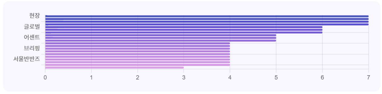 - 3월 1주 중앙행정기관과 광역자치단체 유튜브 채널에 게재된 영상의 제목에서 키워드를 추출하여 분석합니다. 이번 주에는 현장 키워드가 총 7건으로 가장 많았습니다. 아무래도 현장 동정 영상이 다수를 차자하기 때문이 아닐까 싶습니다. 뒤를 이어 글로벌 > 어센트의 순으로 나타났습니다. (참고로 어센터는 재외동포청에서 게재한 아이돌 직캠 영상의 주인공입니다.)