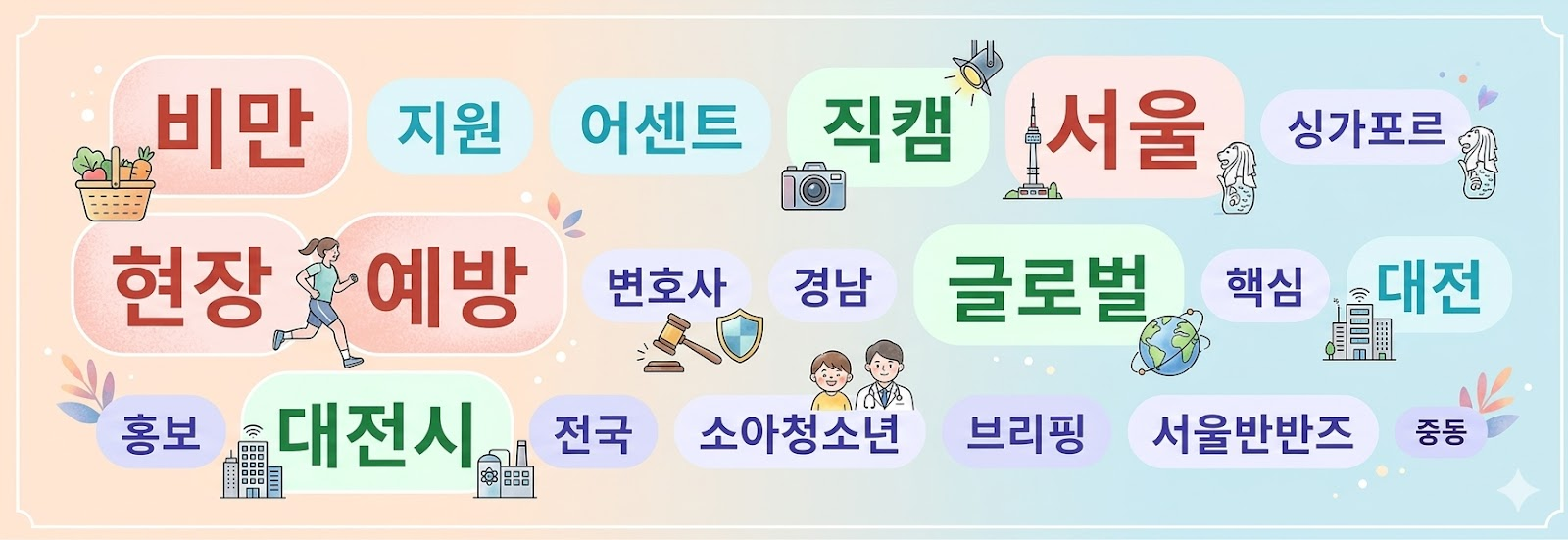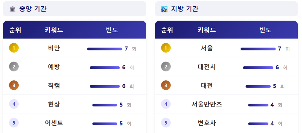 - 기관별로 살펴보면, 중앙행정기관의 경우에는 비반 키워드가 가장 많았고, 2위 키워드는 예방이었습니다. 질병관리청에서 게재한 소아청소년 비만예방을 위한 전문가 인터뷰 영상을 다수 게재한 영향으로 보입니다. 3위 키워드는 직캠으로 재외동포청의 아이돌 직캠 영상의 영향으로 보입니다.