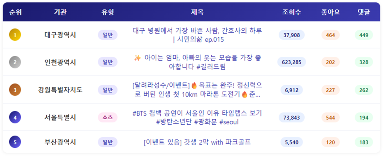 댓글과 좋아요 상위권에서는 현장의 이야기가 두드러지는 특징을 보이고 있습니다. 대구광역시 <간호사의 하루> 영상은 조회수(3.7만) 대비 댓글(449개) 비율이 매우 높게 나타났습니다. 특정 직업군의 노고에 대한 공감과 응원이 활발한 소통을 이끌어냈습니다. 강원특별자치도<마라톤 도전기> 역시 7천 회 미만의 낮은 조회수에도 불구하고 262개의 댓글이 달렸습니다. 도전, 완주라는 서사가 시청자의 참여를 유도한 것으로 보입니다. 조회수가 낮더라도 시민의 삶에 깊숙이 들어간 '사람 냄새 나는 이야기'는 진성 팬덤과 소통을 만드는 데 효과적임을 보여줍니다.