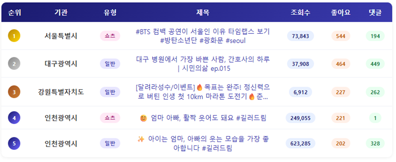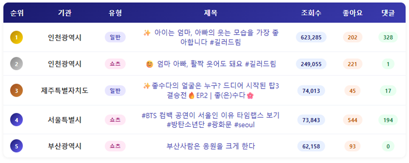 '전 세계적 팬덤을 보유한 키워드를 서울의 랜드마크(광화문 등)와 결합하여 시각적(타임랩스)으로 풀어낸 '서울특별시의 'BTS 컴백 공연' 타임랩스 영상이 좋아요 1위를 기록했으며, 댓글 수에서도 높은 수치를 기록했습니다. BTS가 광역자치단체에도 영향을 미치고 있음을 확인할 수 있었습니다.