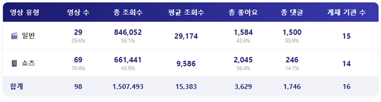 - 일반영상이 영상 수에서는 크게 적은 수량을 보여주었지만, 조회수 등의 성과에서는 오히려 반대의 모습을 보여주고 있습니다. 일반영상의 조호수는 84만회로 쇼츠영상보다 약 20만회 많게 나타났습니다. 이 수치만 놓고 보면 일반영상에서 조회를 유인하는 소재를 활용했다고 분석할 수 있겠습니다. 하지만 실제 데이터를 살펴보면 인천광역시에서 이번에 추진한 정책인 '길러드림' 영상의 조회수가 매우 높게 나타나, 앞서 이야기한 분석은 맞지 않았습니다. 실제로 인천광역시 길러드림 일반 영상의 경우 조회수가 60만회 이상을 기록했으며, 같은 소재의 쇼츠영상도 20만회 이상의 조회수를 기록했습니다. 해당 영상을 제외하면 일반영상의 조회수 수치는 쇼츠영상보다 낮습니다.