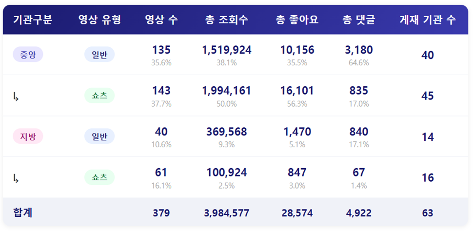 - 조회수 등 상세 수치를 분석해보면, 총 조회수는 398만회이며, 이 중 중앙행정기관은 351만회, 광역자치단체는 47만회로, 중앙행정기관의 조회수 비중이 88%에 달하는 놀라운 수치 성과를 보여주었습니다. 이는 중앙행정기관에서 조회수에 집중한 것도 있지만, 광역자치단체의 조회수가 다른 기간 대비 낮은 영향도 있습니다. 영상 수는 증가했지만, 조회수 수치는 오히려 낮아지는 주간이었습니다. 그 외에 좋아요와 댓글 역시 중앙행정기관에서 많은 성과를 보여주고 있었습니다.