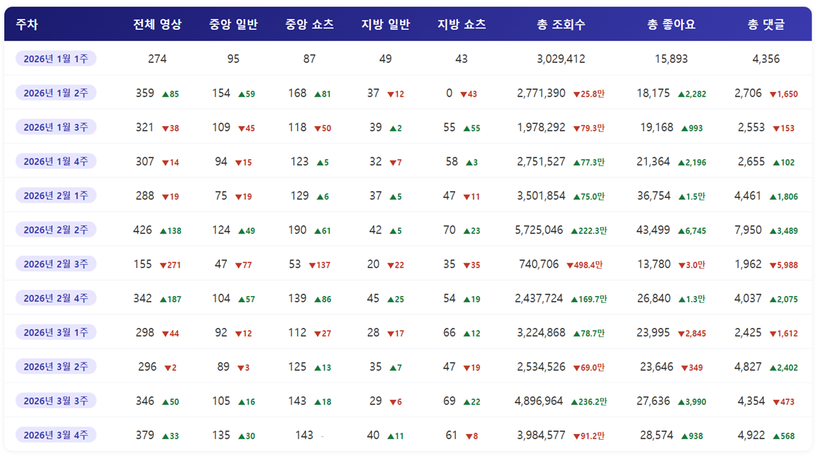 [2026년 3월 4주] 종합 ㅣ 조회수 감소, 좋아요와 댓글은 증가, 어떻게 봐야 할까?