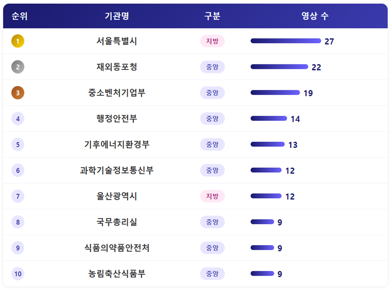 - 영상 수를 살펴보면, 서울특별시가 27편으로 가장 많은 영상을 게재했습니다. 더불어 63개 기관 중 49개(78%)가 주 3편 이상 활발히 운영 중인 것으로 나타났습니다.