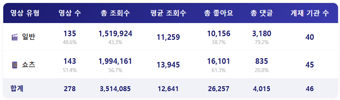 - 2026년 3월 4주 중앙행정기관 유튜브 채널에 게재된 영상 분석 결과, 한 주간 게재된 영상 수는 총 278건이며, 이 중 일반영상은 135건, 쇼츠영상은 143건이었습니다. 일반영상의 영상 수가 증가하면서 영상 유형별 격차는 다른 기간 대비 줄어든 것으로 나타났습니다. 조회수와 좋아요 수는 쇼츠영상이 더 많았으며, 평균 조회수 역시 일반영상 보다 쇼츠영상이 더 많았습니다.