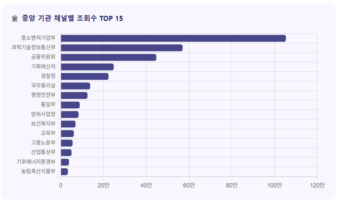 - 기관별 조회수 순위를 살펴보면, 중소벤처기업부가 총 100만 회를 넘으며 가장 많은 수치를 기록했습니다. 최근 중점적으로 추진 중인 '모두의 창업'과 관련하여 다수 영상 제작 및 광고 집행의 추진 결과로 보입니다. 뒤를 이어 과학기술정보통신부도 60만 회에 육박하는 조회수를 기록하고 있는데 , 현장 동정 영상이 다수를 차지하고 있었습니다.