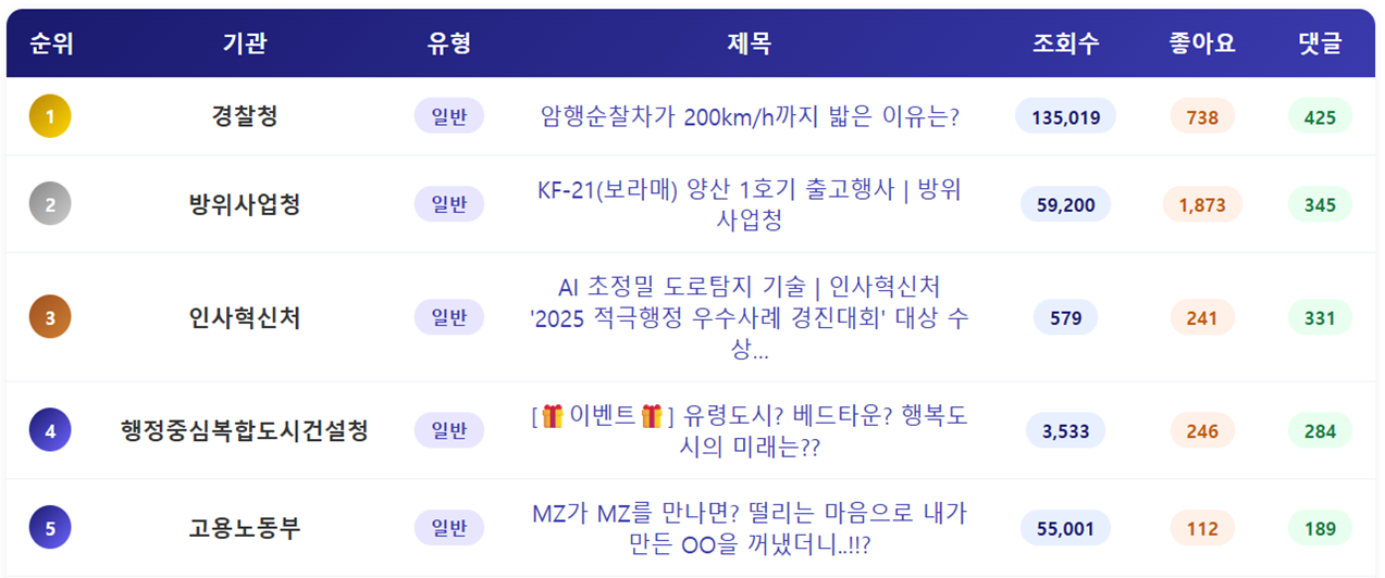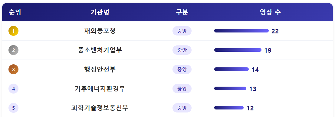 - 가장 많은 영상을 게재한 기관은 재외동포청으로 22건을 게재했습니다. 올 초반 아이돌 직캠을 시작으로 오리지널 콘텐츠를 꾸준히 확대하고 있으며, 웹예능 영상 등 다양한 유형의 영상과 이를 재편집한 쇼츠영상 등 다수으 영상을 운영하고 있습니다. 최근 중앙행정기관이 현장 동정 중심의 쇼츠영상을 중심으로 운영이 되고 있는 것과는 차별화된 운영을 보여주고 있습니다.