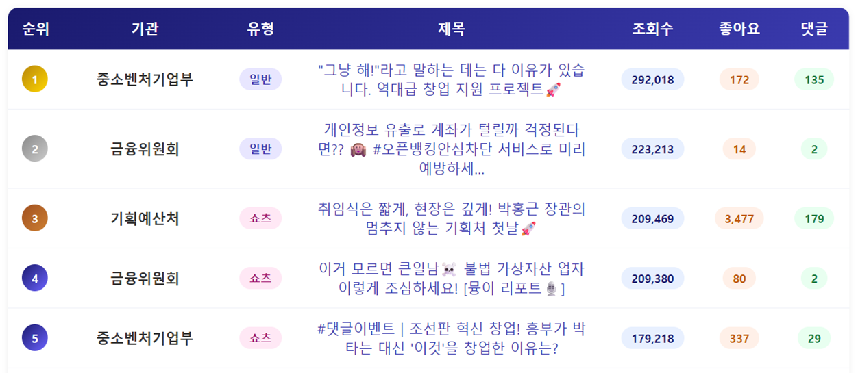 - 더불어 기획예산처 박홍근 장관의 취임식을 소재로한 영상이 조회수는 물론 좋아요, 댓글에서도 매우 높은 수치를 기록하고 있는 중입니다. 특히 쇼츠영상에 거의 200개에 달하는 댓글이 남겨져 있는 것을 보면, 박홍근 장관에 대한 관심이 매우 높음을 확인할 수 있습니다. 기획예산처는 국민이 왜 박홍근 장관에 열광하는지, 이후 이러한 반응을 이끌어 가기 위해 어떤 방법이 있는지 고민해야 합니다.