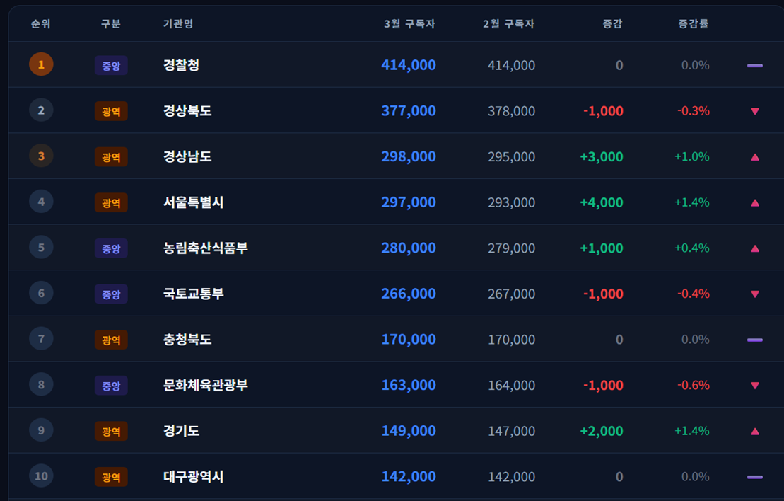 - 가장 많은 구독자를 확보한 기관은 경찰청으로 총 41만 4천명이었습니다. 이는 전월과 동일한 구독자수였습니다. 뒤를 이어 경상북도가 37만 7천명 > 경상남도가 29만 8천명으로 나타났습니다. 경상남도는 2월에 6000명 증가, 3월에 3000명 증가하여 이러한 추세로는 다음 달에 30만 명 구독자를 달성할 수 있을 것으로 보입니다.