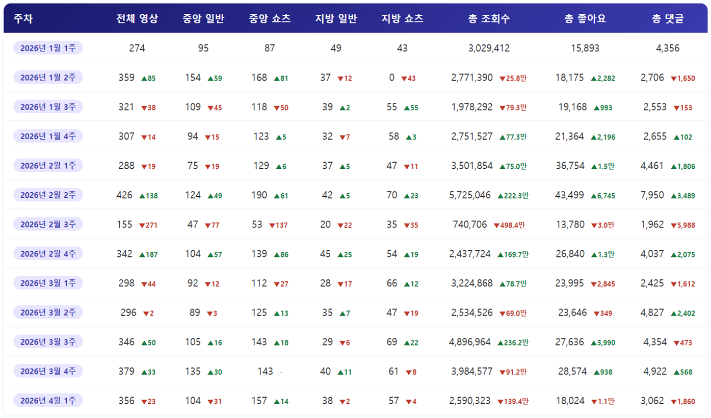 한 주 동안 중앙행정기관과 광역자치단체 유튜브 채널에 게재된 영상을 분석합니다. 전체적인 수치의 흐름, 주요한 트렌드 등을 살펴보며, 이들 채널이 가진 영향력과 정보 전달 효과 등을 함께 알아보도록 하겠습니다.