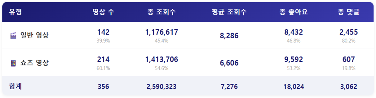 - 영상 유형별로 살펴보면 일반영상이 142건, 쇼츠영상이 214건으로, 쇼츠영상이 전체의 60.1%를 차지했습니다. 조회수와 좋아요 수는 쇼츠영상이 더 많았으며, 댓글은 일반영상이 전체 댓글의 80%를 차지하는 모습을 보여주었습니다. 다만, 평균 조회수를 살펴보면 오히려 일반영상이 더 많은 것을 알 수 있습니다.