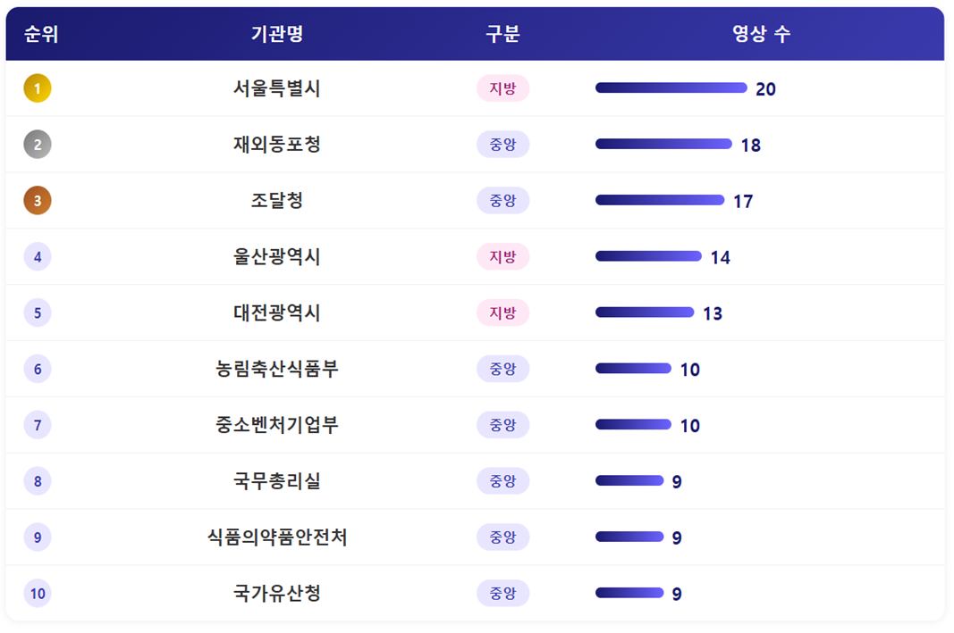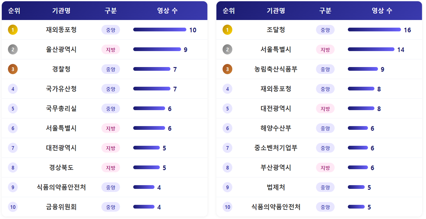- 영상 수의 경우 서울시가 총 20건의 영상을 게재해 가장 많은 영상 수를 기록했습니다. 뒤를 이어 재외동포청이 18건, 조달청 17건의 순이었습니다. 조달청이 17건의 영상을 게재한 게 다소 의아한 부분인데, 대부분의 영상이 코리아 나라장터 엑스포를 소재로한 쇼츠영상으로 확인됐습니다. 조달청에 중요한 행사인 만큼, 현장방문, 정보전달 등 다양한 형태로 소개되었습니다.