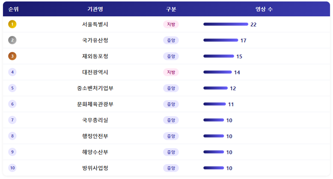 - 영상 수를 살펴보면 서울특별시가 한 주간 22건의 영상을 게재해 가장 많았습니다. 이 중 쇼츠영상은 14건이었습니다. 뒤를 이어 국가유산청이 17건을 게재해 눈길을 끌었습니다. 특히나 국가유산청은 일반영상을 무려 13건이나 올렸는데, 우리나라의 유네스코 세계문화유산을 소개하는 비주얼 중심의 영상이 다수를 차지했습니다.