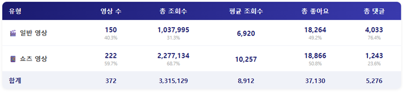 - 영상 유형별로 살펴보면 일반영상은 150건인 반면, 쇼츠영상은 222건으로 큰 차이를 보였습니다. 조회수에서도 일반영상의 조회수를 크게 웃돌았지만, 좋아요 수는 비슷했으며, 댓글에서는 일반영상이 더 많았습니다.