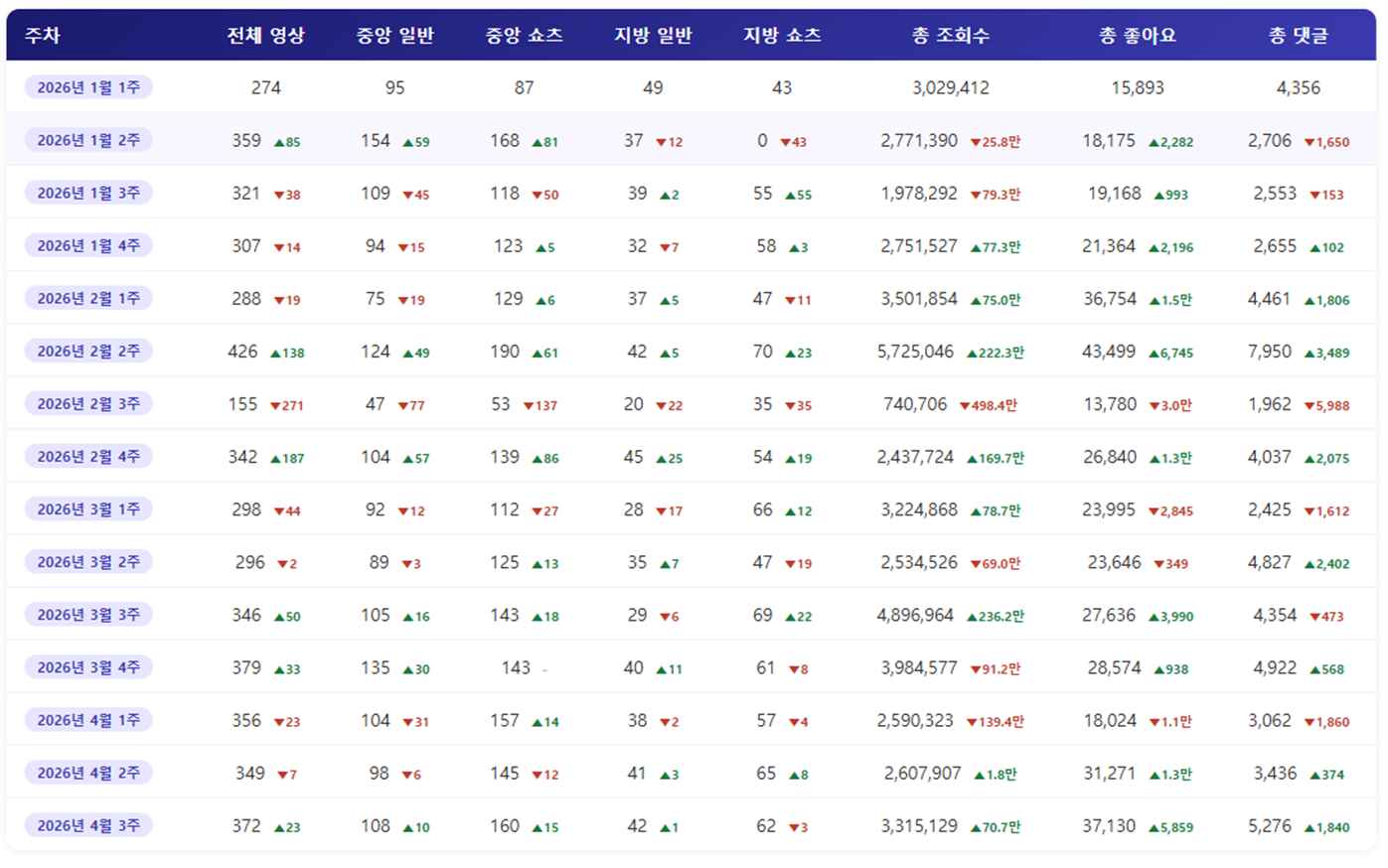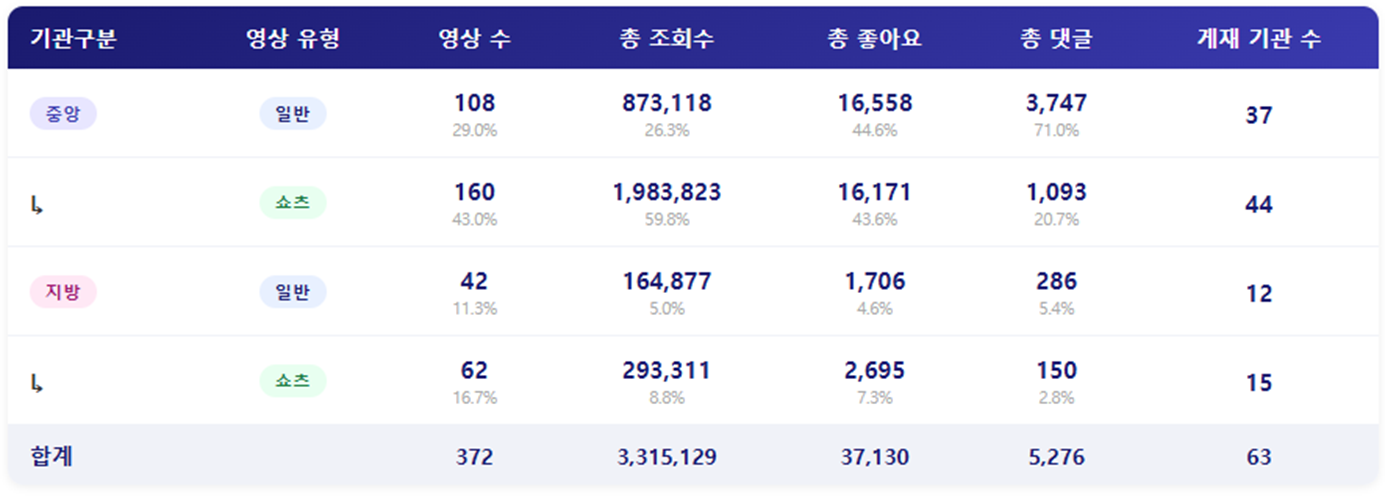 - 2026년 4월 3주 중앙행정기관과 광역자치단체 유튜브 분석 결과, 한 주간 게재된 영상 수는 총 372건이며, 이 중 중앙행정기관이 268건을, 광역지차단체게 104건을 게재했습니다. 기관 구분과 영상 유형별로 살펴보면 중앙행정기관의 쇼츠영상이 총 160건으로 전체 영상 수의 43%를 차지했습니다.