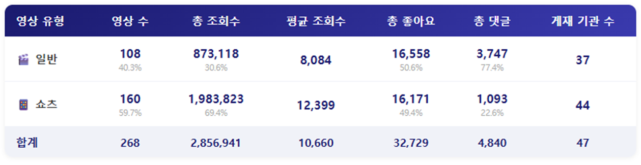 - 다만, 좋아요와 댓글에서는 여전히 일반영상이 더 강세를 보이고 있습니다. 좋아요의 경우에는 영상 수가 적은 일반영상이 다소 높게 나타났습니다. 이용자들이 현장을 빠르게 전달하는 쇼츠영상 보다 일반영상에 더 많은 호감을 보이고 있다고 분석해볼 수 있습니다.