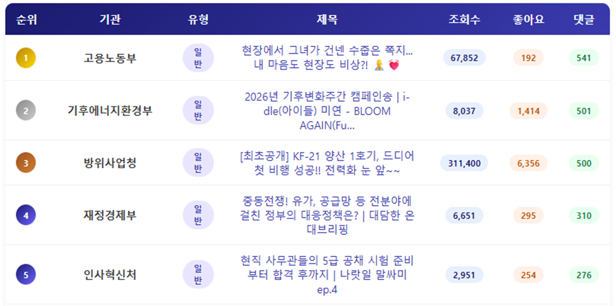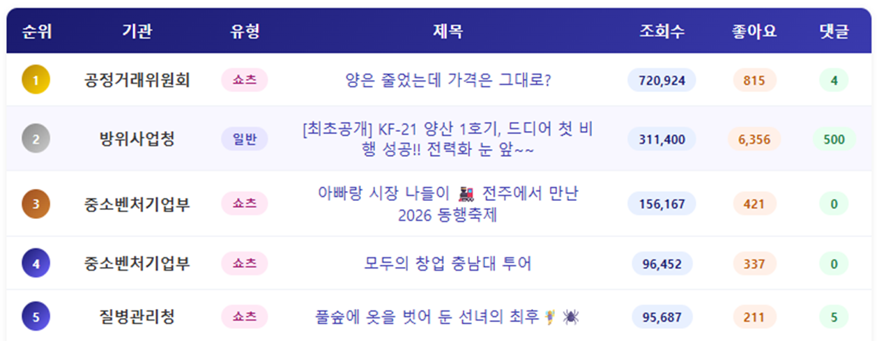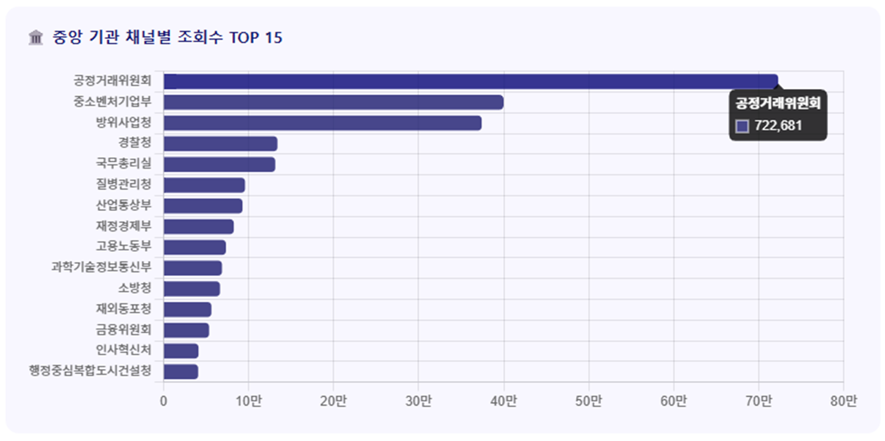 - 채널별 조회수를 분석해보면, 공정거래위원회가 72만회로 가장 많았습니다. 1개 영상이 대부분의 조회수를 기록하고 있는 것을 알 수 있습니다. 뒤를 이어 중소벤처기업부가 40만회를 기록했으며 뒤를 이어 방위사업청이 40만회에 가까운 조회수를 기록했습니다. 중소벤처기업부는 모두의창업과 함께 동행축제 콘텐츠가 높은 조회수를 기록했으며, 방위사업청은 KF-21 영상이 다시 한 번 높은 수치 성과를 기록했습니다.