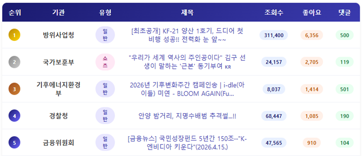 - 방위사업청의 효자템이 다시 한 번 효자노릇을 했습니다. 4월 3주 가장 많은 좋아요 수를 기록한 영상은 방위사업청 <[최초공개] KF-21 양산 1호기, 드디어 첫 비행 성공!! 전력화 눈 앞~~>으로, 수집일 기준 6300여 개를 기록했습니다. 방위사업청의 KF-21은 꾸준히 높은 반응을 이끌어 내고 있는 소재이지만, 그 외의 무기에 대해서는 관심이 낮아 방위사업청으로서는 고민이 되는 부분으로 보입니다. 이와 함께 좋아요 수 3위를 기록한 기후에너지환경부의 캠페인 송 영상의 경우 조회수는 낮은 편이지만 상대적으로 좋아요 수가 높게 나타났습니다. 이는 이벤트 진행의 영향고 함께 아이돌 팬심이 작용했을 것으로 보입니다.