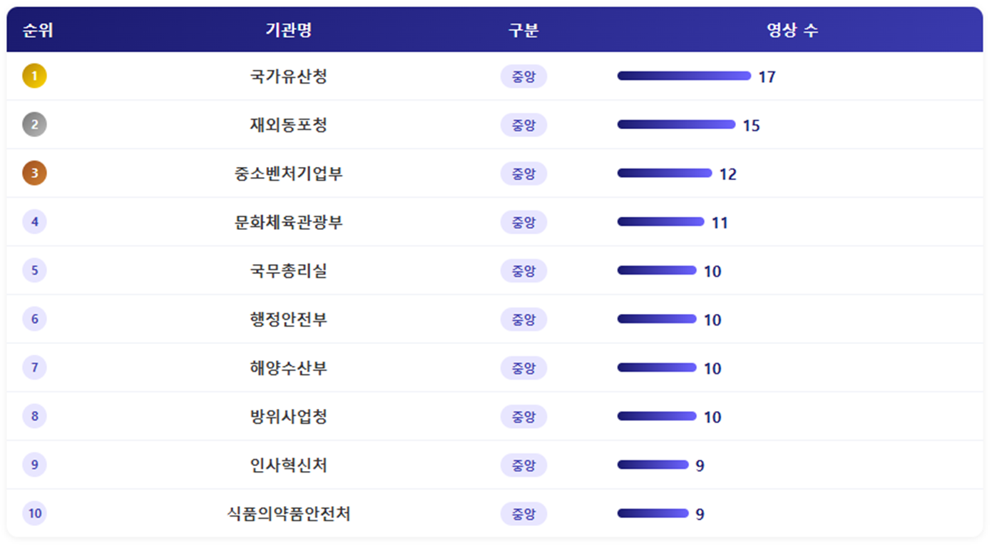- 영상 수에서는 국가유산청이 17건으로 가장 많았습니다. 앞서 이야기한 것처럼 우리나라의 유네스코 세계유산을 소개하는 영상이 다수 게재된 영향입니다. 뒤를 이어 재외동포청 > 중소벤처기업부 > 문화체육관광부 순이었습니다. 문화체육관광부는 쇼츠영상이 8건이나 되는 것도 눈에 띄는 부분이었습니다.