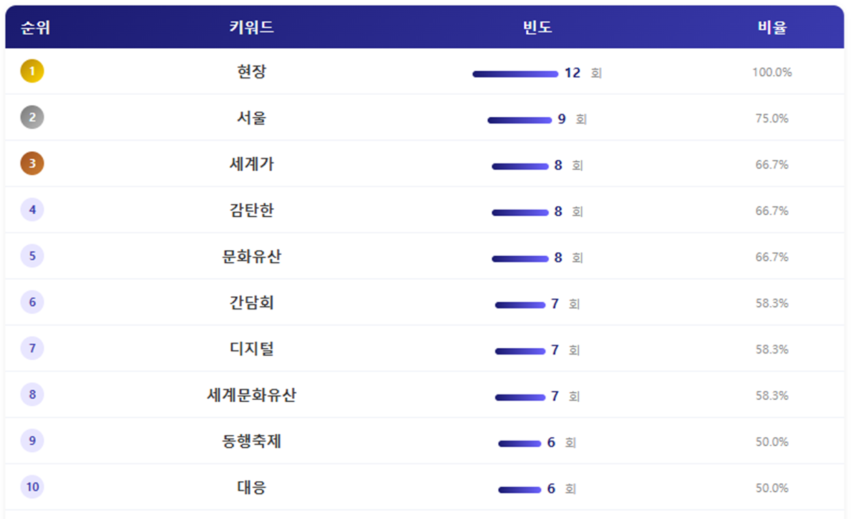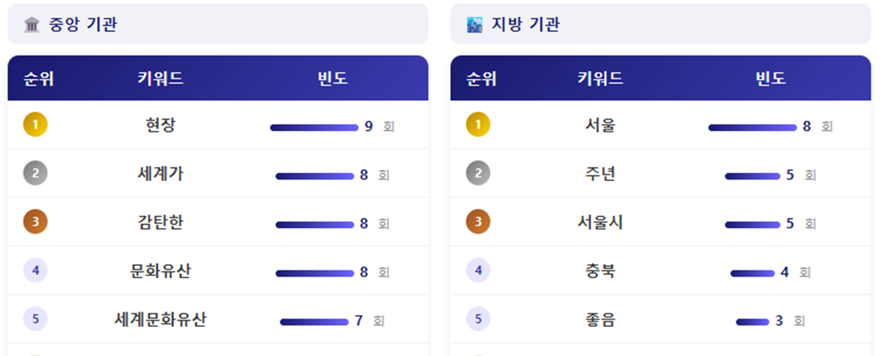 - '현장' 키워드가 많은 이유는, 최근 들어 중앙부처를 중심으로 현장 동정을 쇼츠영상으로 다수 게재하는 흐름을 확인할 수 있는데, 이러한 영상 게재의 영향으로 확인됩니다. 현장 중심의 행정 운영이 확실히 강조되고 있습니다.