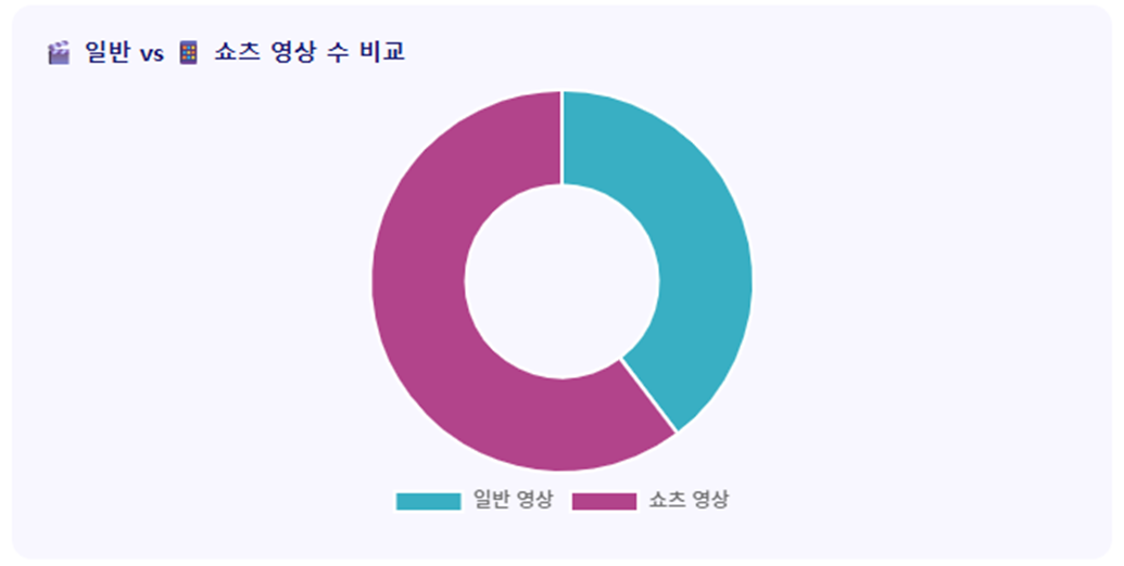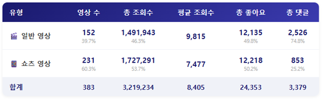 - 영상 유형별로 성과를 확인해보면, 일반영상은 152건인 반면, 쇼츠영상은 231건으로 60% 이상을 차지하고 있었습니다. 이어서 조회수와 좋아요 수에서도 쇼츠영상이 강세를 보였지만, 댓글에서는 큰 격차로 일반영상이 더 많았습니다.