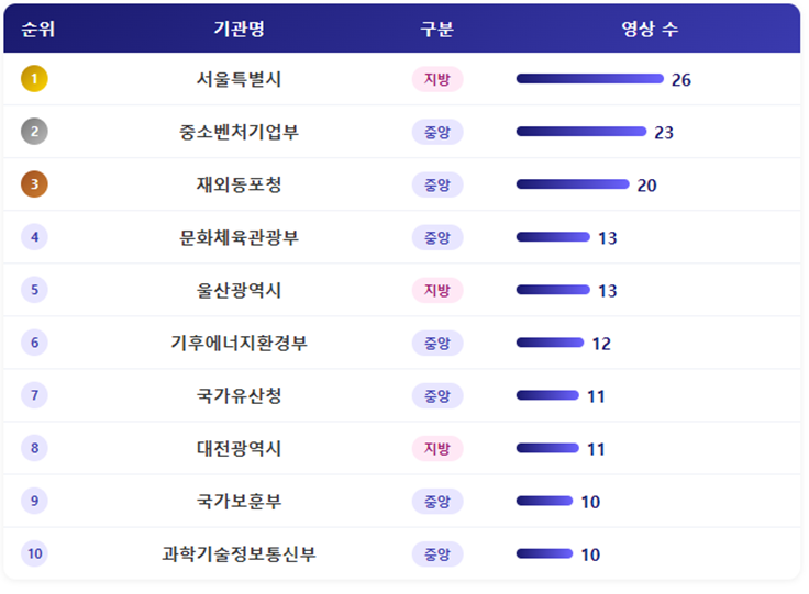 - 2026년 4월 4주 중앙행정기관과 광역자치단체 68개 유튜브 채널의 영상 분석 결과, 한 주간 게재된 영상 수는 총 383건으로, 이 중 중앙행정기관이 278건으로 전체 영상의 70% 이상을 차지했습니다. 광역자치단체 영상은 105건이었습니다.