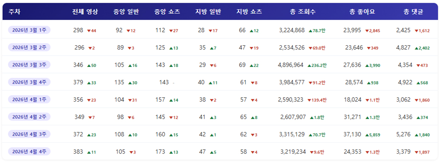 한 주 동안 중앙행정기관과 광역자치단체 유튜브 채널에 게재된 영상을 분석합니다. 전체적인 수치의 흐름, 주요한 트렌드 등을 살펴보며, 이들 채널이 가진 영향력과 정보 전달 효과 등을 함께 알아보도록 하겠습니다.