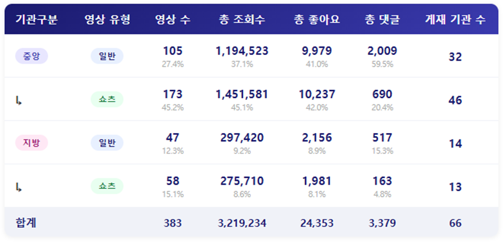 - 이들 영상이 확보한 조회수는 총 321만회였으며, 역시나 중앙행정기관에서 조회수의 상당 수를 차지하고 있었었습니다.(80% 이상) 좋아요 수의 경우에는 좋아요와 댓글에서도 중앙행정기관이 확보한 수치가 월등히 많았으며 그 중에서 좋아요는 중앙행정기관의 쇼츠영상에서, 댓글은 중앙행정기관의 일반영상에서 더 많은 수치를 확보했습니다. 중앙행정기관의 경우 일반영상 보다 쇼츠영상의 영상 수, 조회수가 높기 때문에 좋아요 수가 당연히 높게 나왔다고 볼 수 있지만, 지금까지의 흐름을 보면 일반영상에서 좋아요 수와 댓글 수가 더 높게 나온 것을 반영해볼 때, 쇼츠영상이 조회수와 좋아요 수에서도 강세를 보이고 있음을 알 수 있습니다. 물론 이는 중앙행정기관에의 경우에만 그렇습니다. 더불어 댓글은 여전히 일반영상에서 더 많이 확보되고 있었습니다.