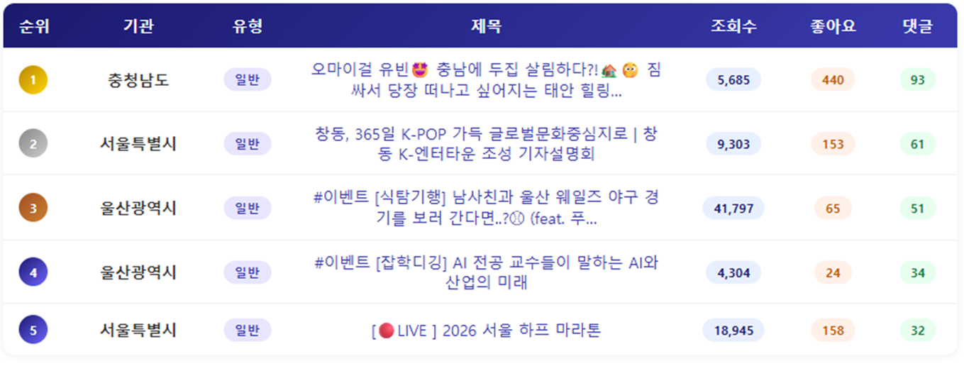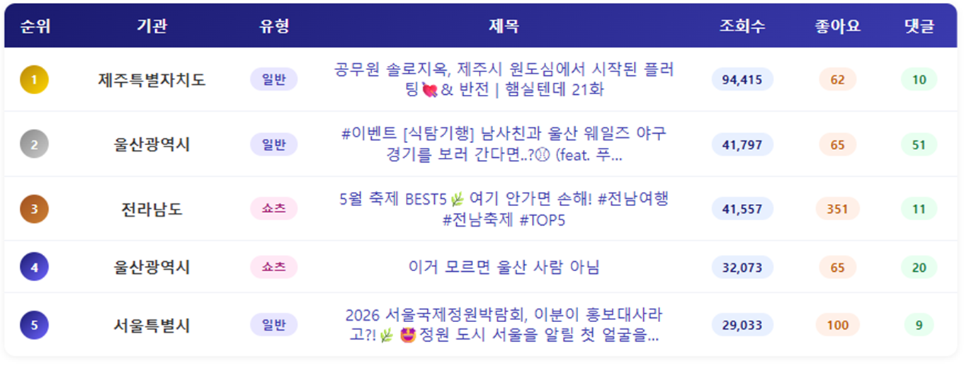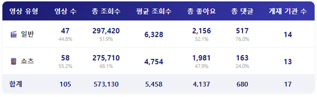영상 수는 쇼츠영상이 많지만, 수치 성과에서는 일반영상이 더 좋게 나타났습니다. 조회수의 경우 일반영상이 약 2만회 놓게 나타났으며, 평균 조회수에서는 큰 차로 일반영상이 높았습니다. 좋아요와 댓글 역시 일반영상에서 높게 나타났습니다. 이를 분석해보면, 중앙행정기관과 마찬가지로 쇼츠영상을 다수 제작하고 있지만, 중앙행정기관에 비해 일반영상에 대한 집중도가 높음을 알 수 있습니다. 즉, 영상 소재, 구성, 제작 투입 공수 등에서 일반영상이 더 많은 비중을 차지하고 있어, 성과가 일반영상에 더 높게 나타나고 있다고 이야기 할 수 있습니다.