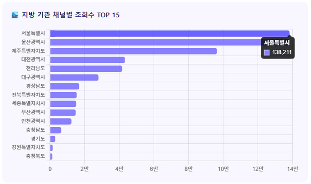 채널별 조회수를 살펴보면 서울시와 울산광역시가 13만 회를 넘으며 각각 1위와 2위를 차지했습니다. 서울시는 영상 수가 월등히 많기 때문에 당연히 1위를 기록했다 라고 볼 수 있으며, 울산광역시도 영상 수에는 2위를 차지해 조회수도 높게 나타났다고 분석할 수 있습니다. 특히나 울산광역시는 조회수 상위 5건 중 2건이 포함되어 있어 전체 조회수에 영향을 미쳤습니다.